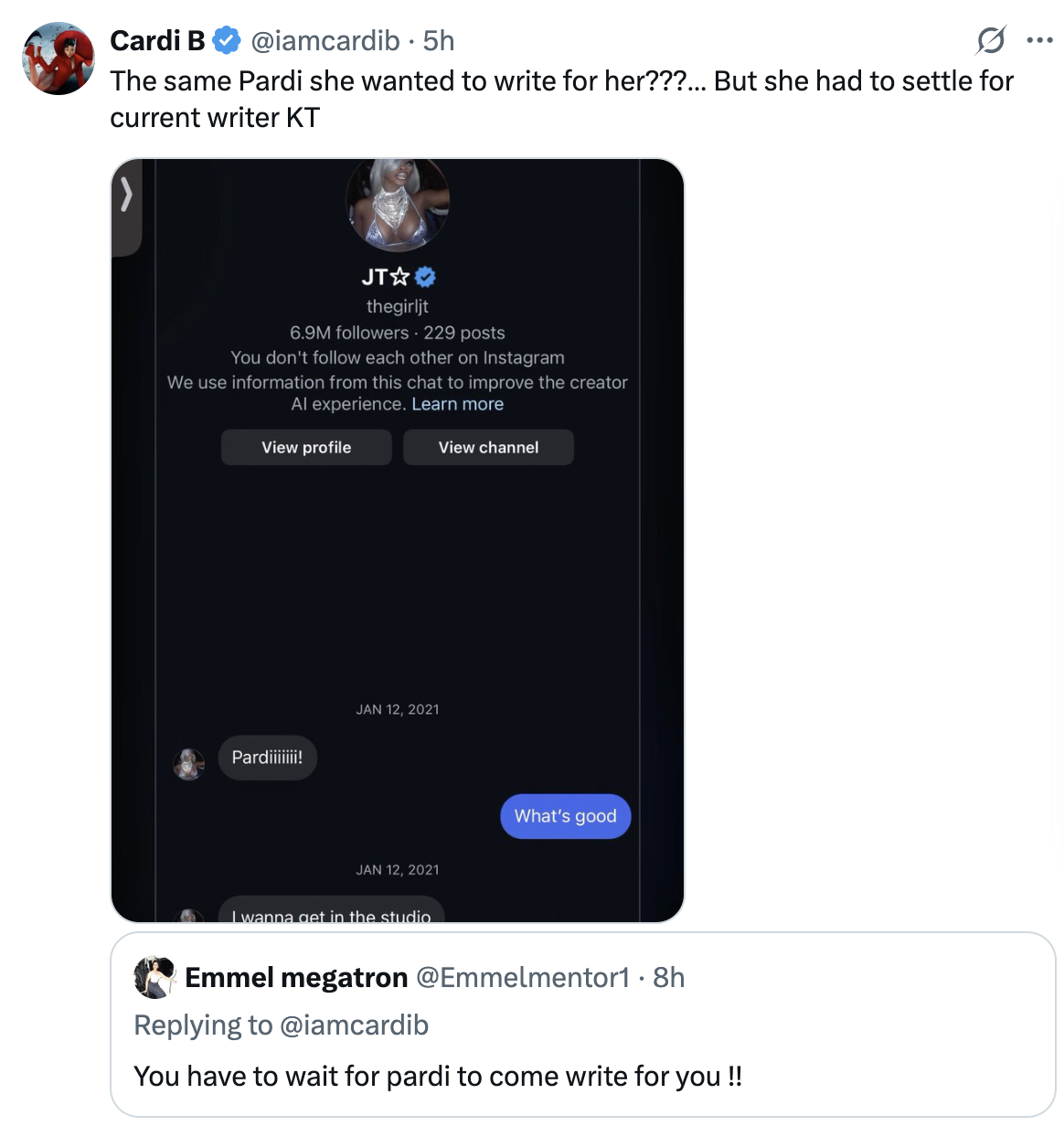 Cardi didn’t just laugh it off—she came with receipts. After a user on X (Twitter) accused her of needing Pardison Fontaine to write her bars, Cardi fired back with a screenshot of a direct message JT allegedly sent to Pardi saying, “I wanna get in the studio.”